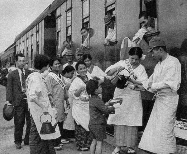 1938年4月21日,胶济铁路张店站,为日军送行的日本国防妇人会侨民。