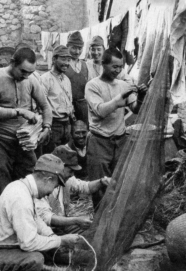 1938年4月5日,津浦线段,整理渔网的日军士兵。