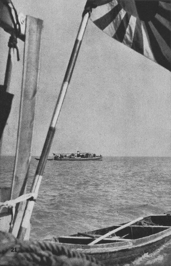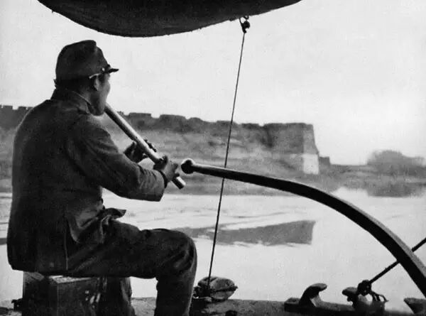 1938年3月14,苏州城外,坐在船上吹笛子的日军士兵。