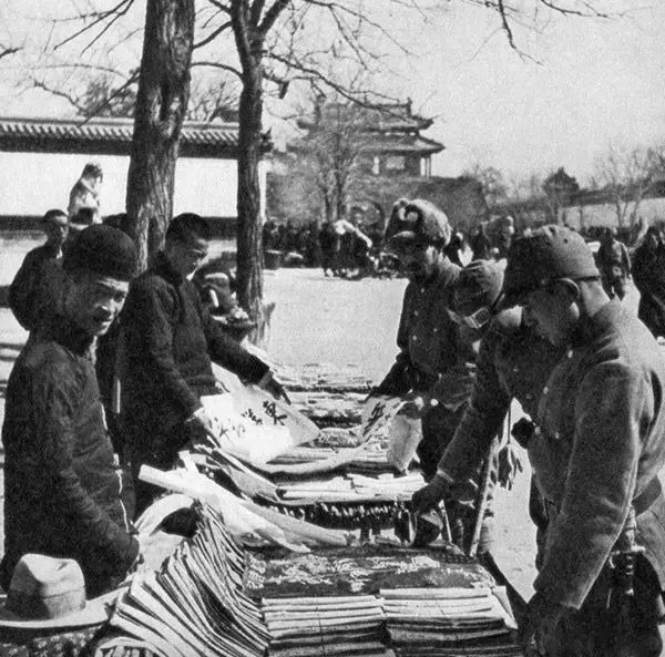 1938年3月1日,日军占领山东曲阜,在孔子庙前观看中国印刷品的日本兵。