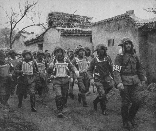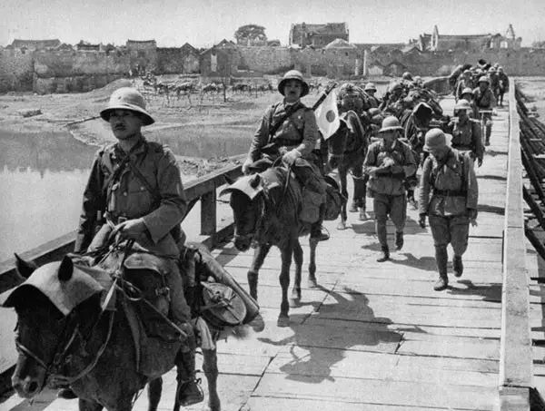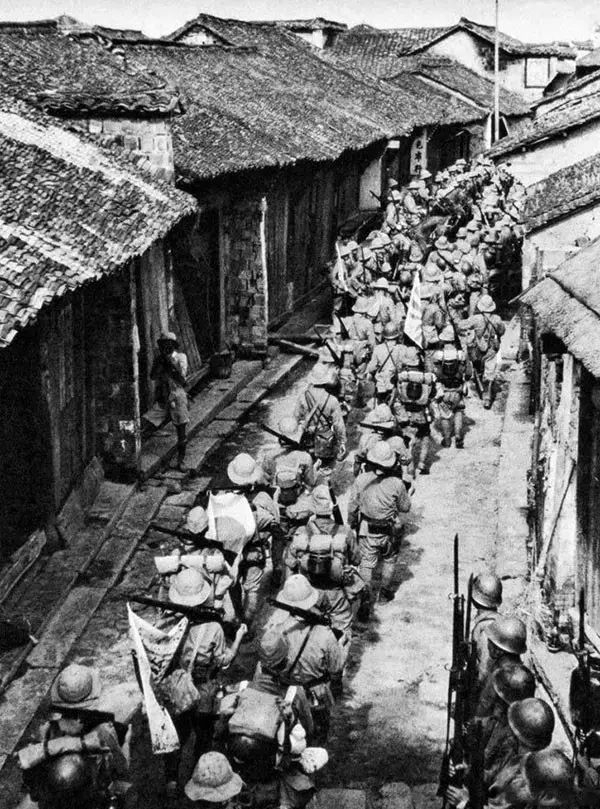 1938年3月27日,徐州会战,日军占领江苏通州,行进在天生港的饭冢部队。