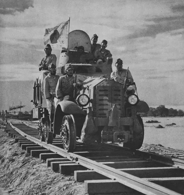 1938年7月31日,蚌埠,津浦线铁路装甲车上扫荡的日军青村铁道部队士兵。
