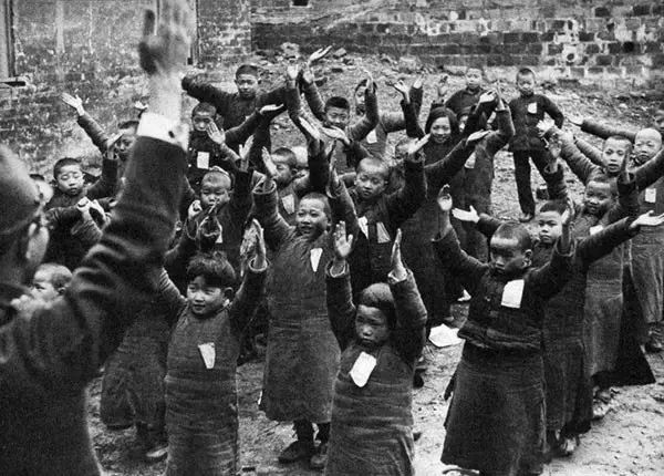 1939年3月12日,湖北蒲圻,教小学生做体操的日军。