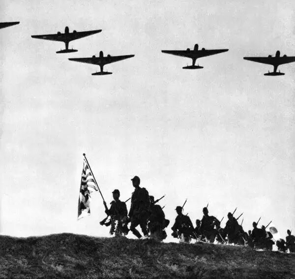 1938年8月25日,九江附近,在飞机掩护下沿着长江岸边西进的日军部队。