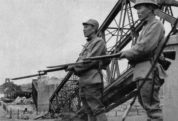 1938年4月20日,蚌埠,站在被中国军队破坏的淮河铁桥旁警戒的日军士兵。