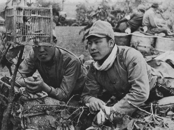 1938年5月17日,朝徐州进攻的日军今田战车队士兵在休息时喂养小鸟。