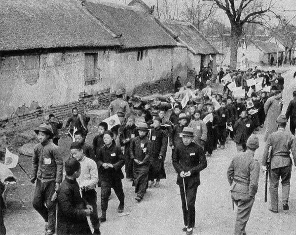 1938年3月27日,山东兖州建国广场,中国小学生手拿日旗的队列。