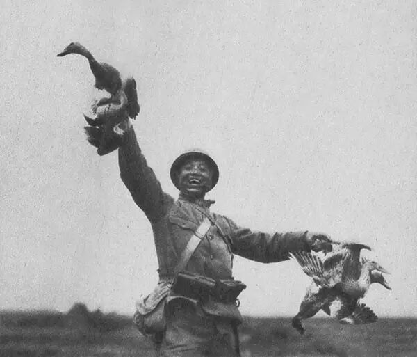 1937年11月18日,江苏傀儡湖畔,拿着鸭子的日军士兵。