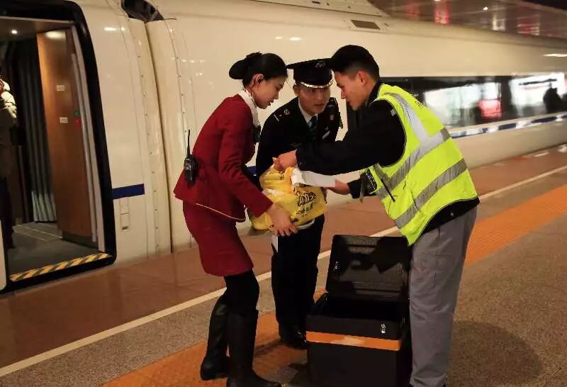 高铁外卖小哥正在和列车工作人员交接外卖。