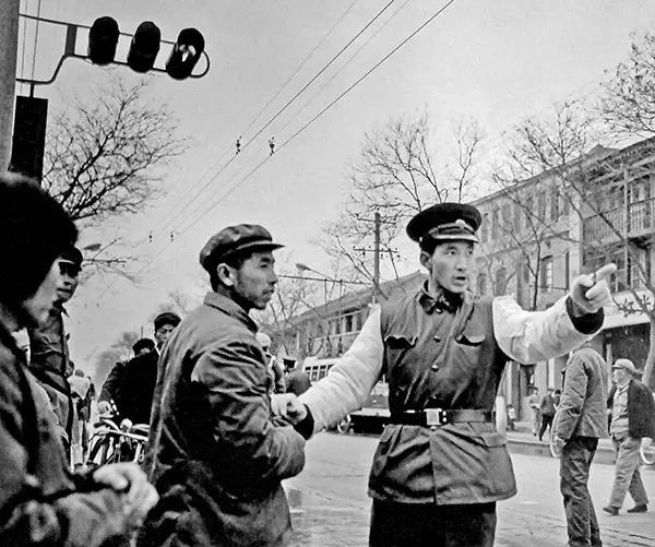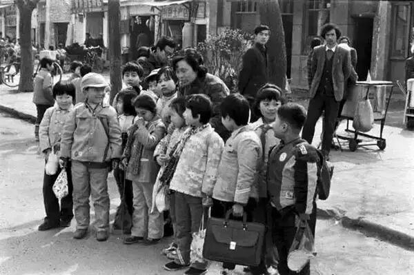 1987年,西安桥梓口,老师护送孩子过马路。赵利文/摄。