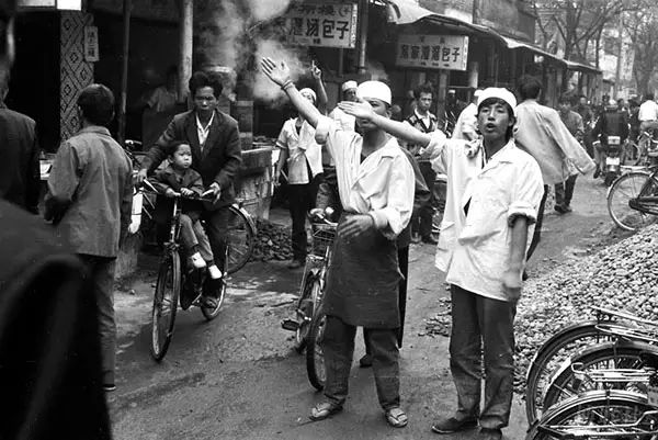 1987年,西安回民街,回民餐馆伙计招呼客人“里面请”。 赵利文/摄。