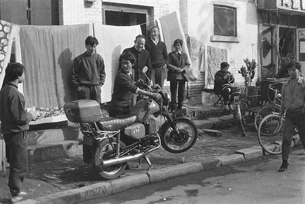 1988年,西安白鹭湾,年轻人与摩托车。赵利文/摄。