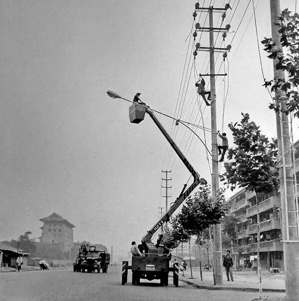 1985年,西安市东门外,架设路灯。刘一/摄。