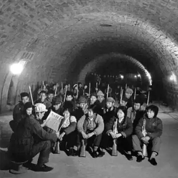 1972年,西安,防空洞里民兵读报学习。刘一/摄。