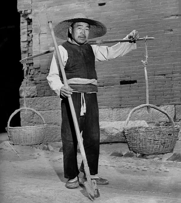 1947年5月,西安临潼县,挑筐收集粪便做肥料的农民。美国《生活》杂志记者/摄。