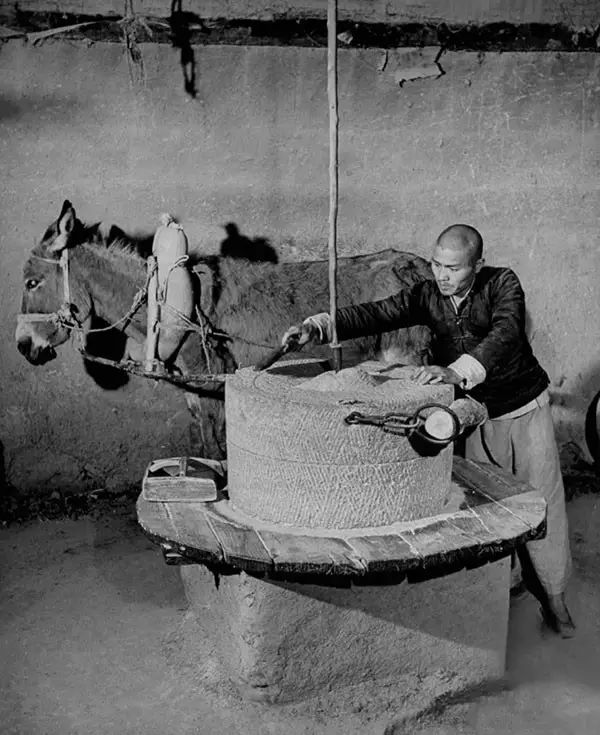 1947年,西安临潼县,毛驴拉磨碾米。美国《生活》杂志记者/摄。