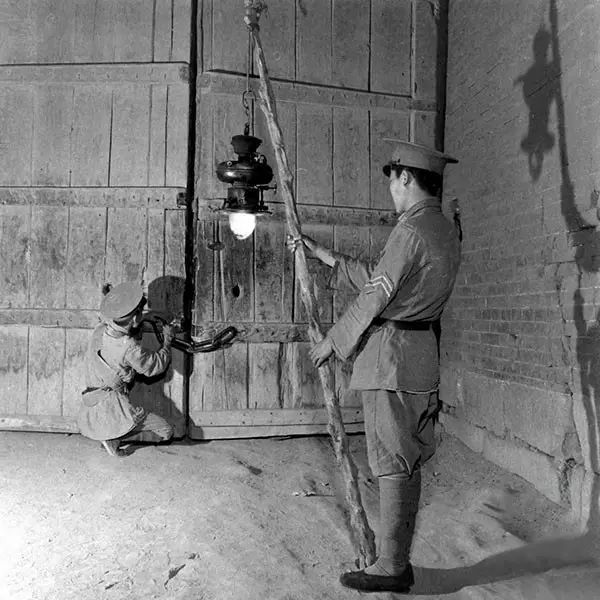 1947年,西安临潼县,门卫士兵晚上锁城门。美国《生活》杂志记者/摄。