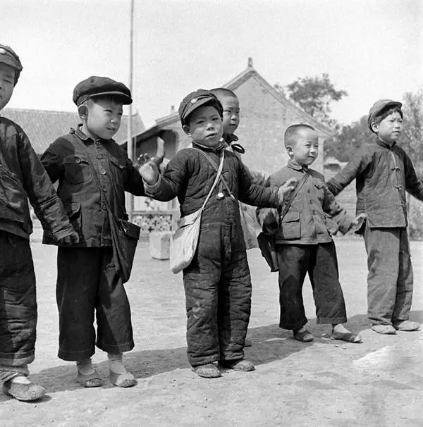 1947年5月,西安临潼县,小学儿童在操场玩游戏。美国《生活》杂志记者/摄。