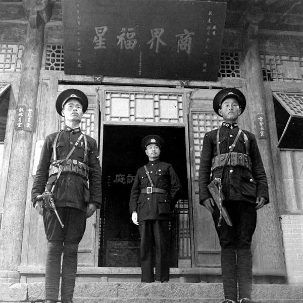 1947年,西安临潼县警局总部,警察局长和站在门口的两位警察。美国《生活》杂志记者/摄。