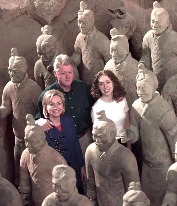 1998年6月26日,西安,美国总统克林顿、夫人希拉里和他们的女儿参观兵马俑博物馆。