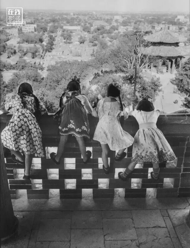 1956年,北京,四名女孩在一个凉亭里俯瞰城市。