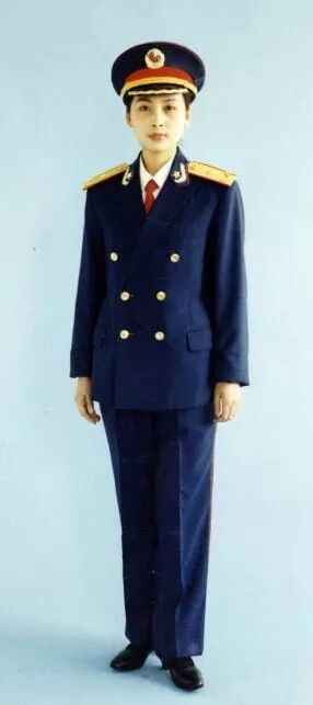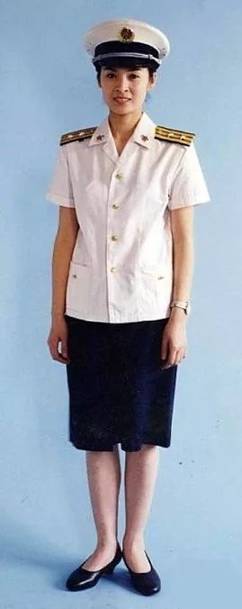 女军官夏常服为小开领,配白衬衣,系玫瑰红色领带。制式衬衣为开领、短袖,配有藏蓝色西服裙;戴大檐帽。冬常服改为开领口,双排6粒扣。戴载绒帽。