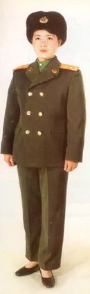 50式女军人冬服为列宁服。小翻领,双排十粒扣,两个下挖袋,有袋盖,西式裤。颜色,陆军为黄绿色,海军为藏蓝色,空军为上黄绿下藏蓝色。面料营以下干部和战士为斜纹布;团以上干部为呢料,其中,团级用粗呢,师级以上用细呢(麦尔登呢)。