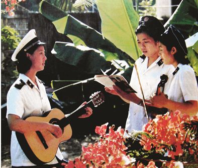 1974年5月1日,经毛泽东主席批准,我军服装进行了一次改革:海军服装全部恢复了1955年的颜色和样式,干部戴大檐帽,战士戴水兵帽、穿水兵服。同时,全军女军人配发裙服,军帽改为无檐软帽,帽顶有军种牙线,陆军正红色、海军白色、空军天蓝色。