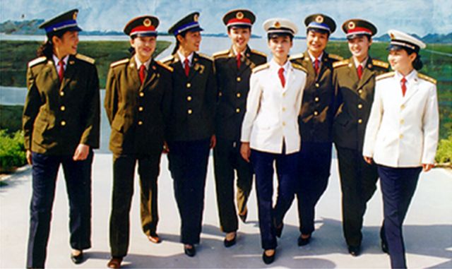 另外,三军女文工团员、女体工队员也配发礼服,样式、颜色与女将校官礼服都不同。区别主要在于单排扣,黑领结,扎武装带,穿长统靴。颜色与三军常服相同,陆军上衣棕绿色,下衣藏蓝色;海军夏季上衣白色,下衣藏青色,冬季上、下衣均为藏青色;空军上衣棕绿色,下衣藏蓝色。