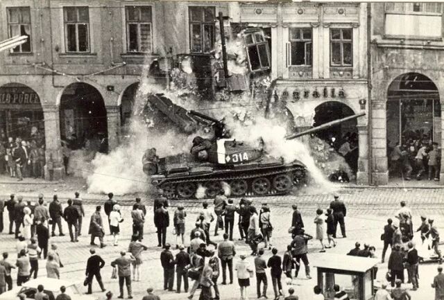 ▼ 1968年,捷克斯洛伐克发起了名为“布拉格之春”的政治体制改革,但在苏联看来,此举有脱离苏联控制的倾向。当年8月,苏联联合另外几个华沙条约成员国一同入侵了捷克斯洛伐克(1968年)