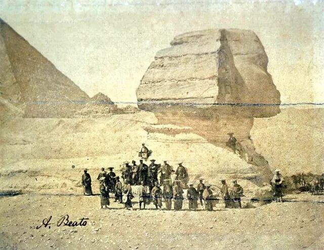 ▼ 在狮身人面像前合影的一群日本武士(1864年)