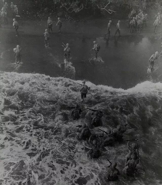 ▼ 美国海军陆战队员离开坦克登陆舰,冲上格鲁彻斯特岬,它位于当时被日军占领的新不列颠岛上(1943年)