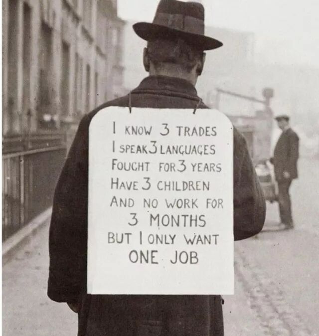 ▼ 经济大萧条背景下艰难求生的失业者,背上的广告牌写着“我了解三个行业,会三种语言,奋斗了三年,有三个孩子,已失业三个月,现在只求一份工作。”(1930年)
