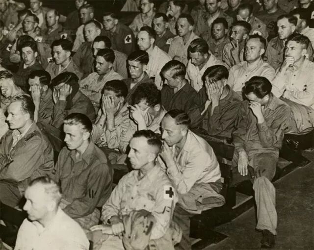 ▼ 美国军营的德国战俘看到纳粹集中营录像时的反应(1945年)