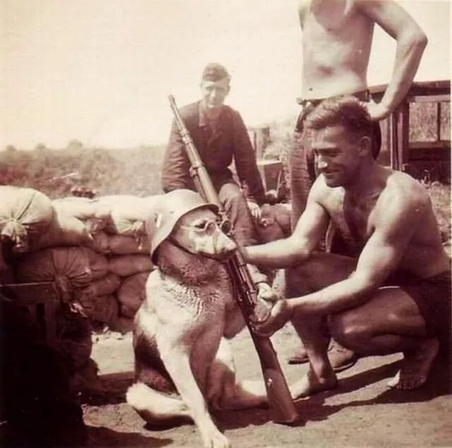 ▼ 德国士兵给军犬乔装打扮(1940年)