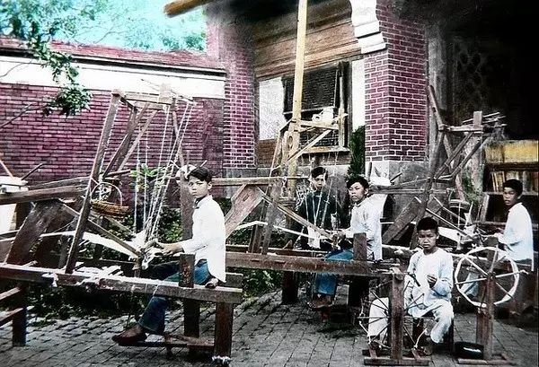 男孩子在学习如何用纺车织布