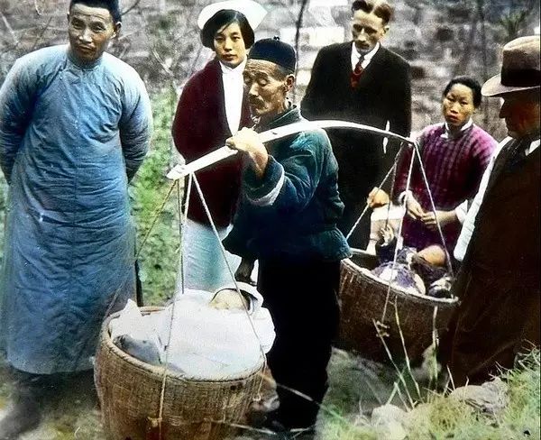 中国购买的飞机用绳子拉到汉口机场,途经一个小镇时,与人力车行构成了显明的对照。