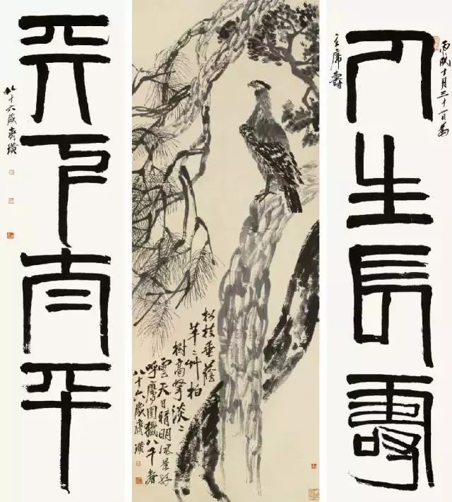 齐白石《 松柏高立图·篆书四言联》