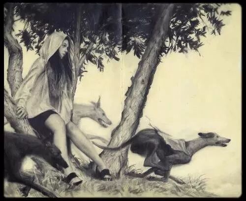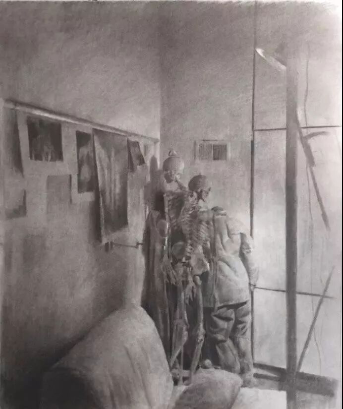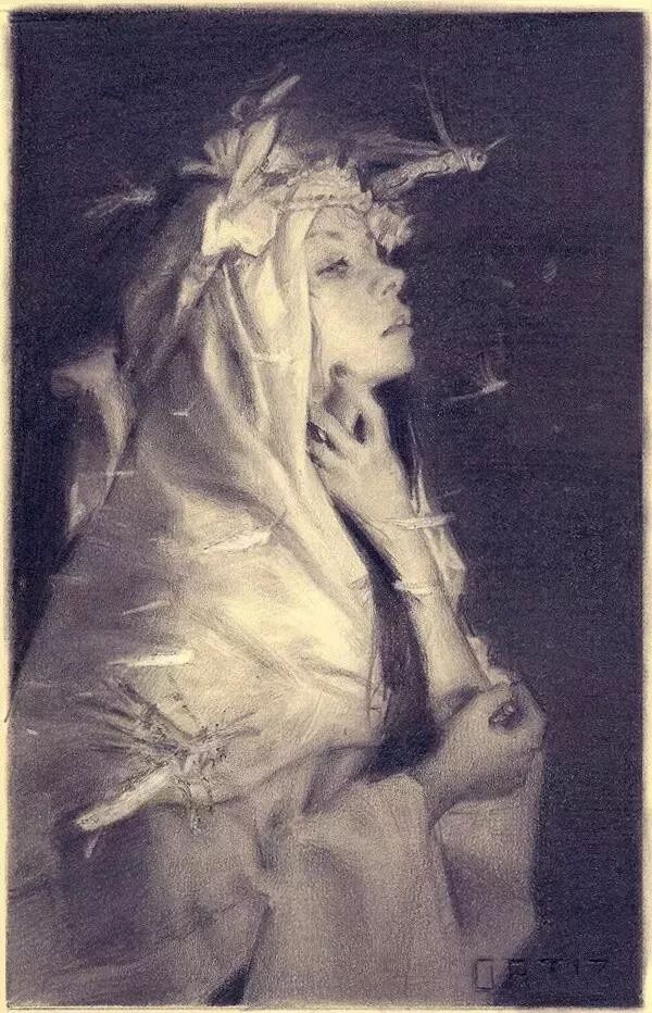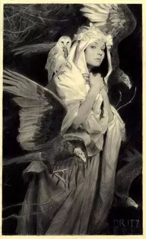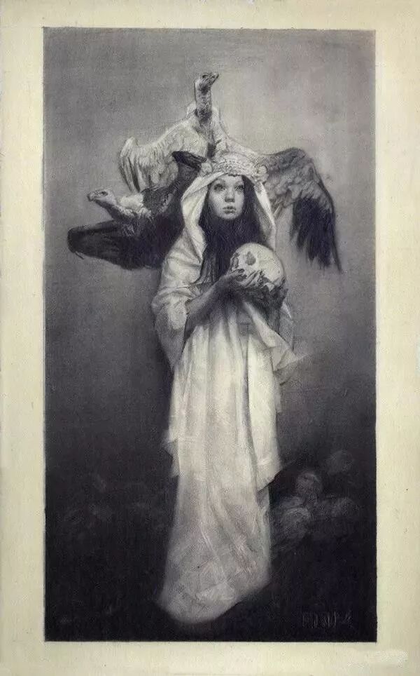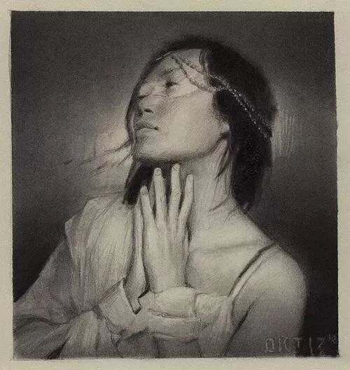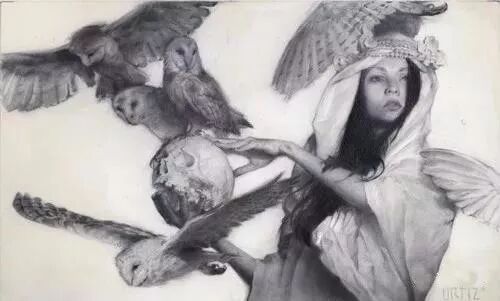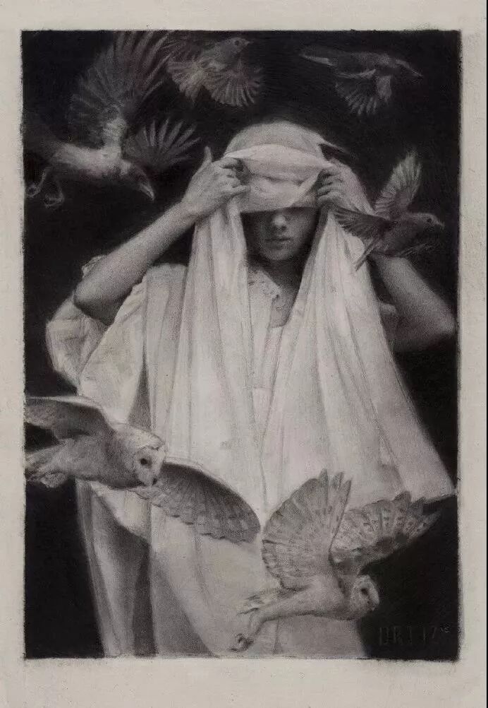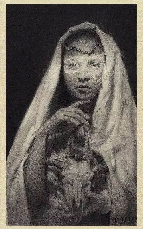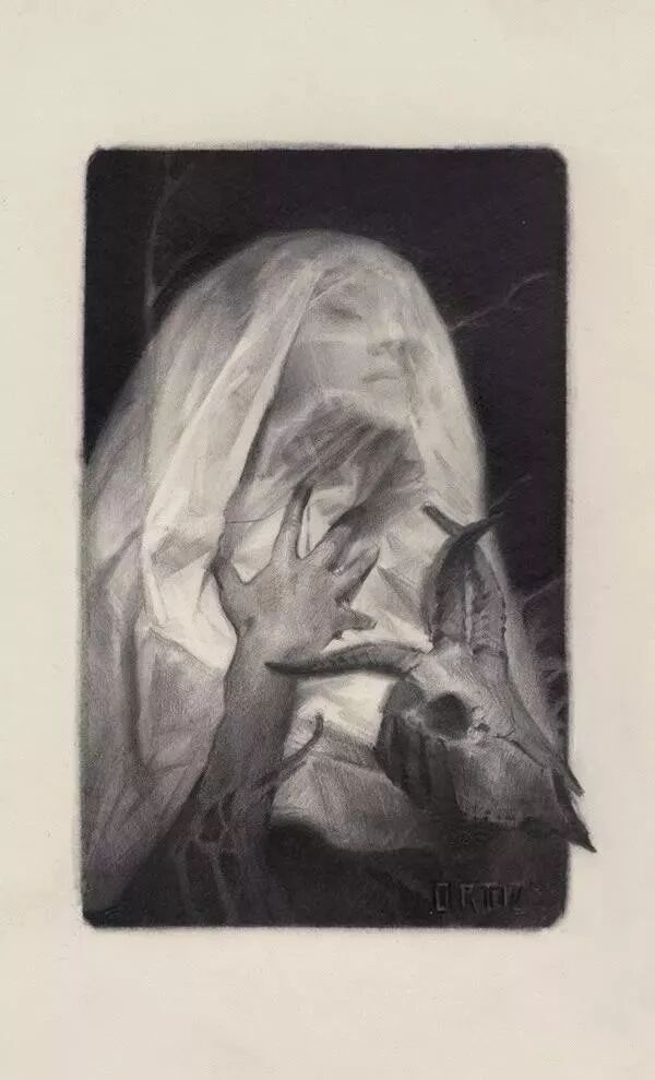 卡拉的素描作品有一种独特的魔幻感。她用朦胧的笔触,以及具有宗教色彩的物体来渲染画作的意境。
