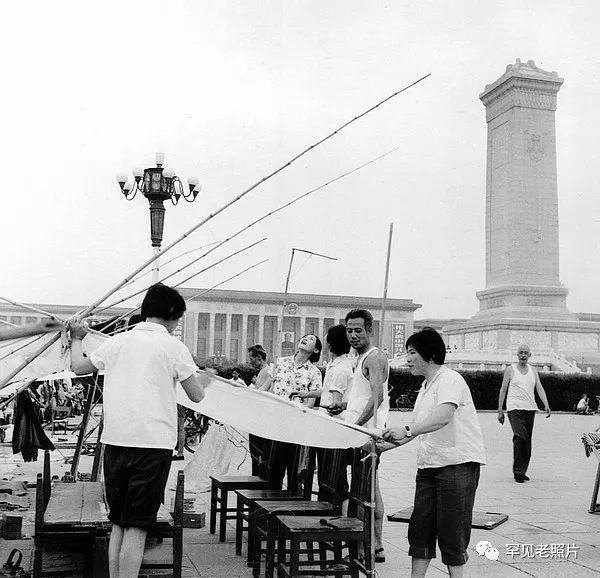 1976年,唐山大地震波及北京,这是在天安门广场塔建抗震棚的群众。顾德华/摄。