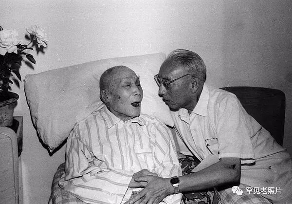 1981年,著名经济学家马寅初(左)百岁寿诞,北京大学历史地理学教授侯仁之前往医院祝贺。顾德华/摄。