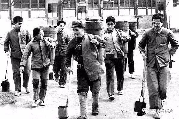 1965年,北京工业大学的学生和崇文区清洁工人(中)一起背粪桶。顾德华/摄。