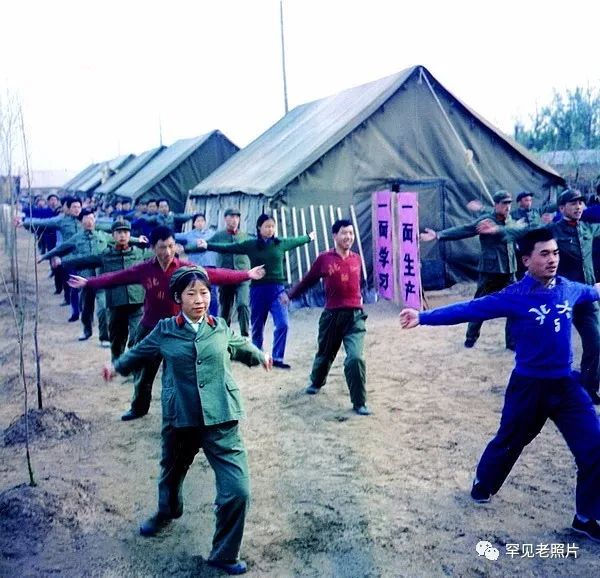 1975年,北京大学工农兵学员在教育基地做操。顾德华/摄。