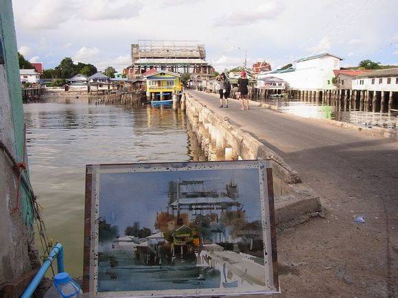 桥、船、牆面、都可以用笔霑清水洗白,就像炭笔素描用软橡皮来画出小亮面的细节一样,然后再叠小灰暗块修饰。从焦点区的路灯、桥、船这裡开始处理,不重要的地方,就先跳过!这最后阶段,最怕画太多细节。
