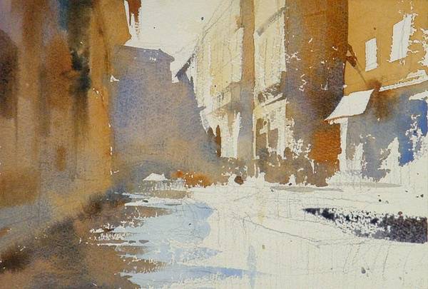 3.等乾透以后,准备画暗块区。我先画中间焦点区这一块。我把这一区块裡面的桥、建筑、船等所有物件,全部当成一个整体来画。用群青、红锗、凡戴克…,随便啦~只要用寒色系和棕色系混合,即可调出很美的中间色调。可以先打湿这一区,再用大笔染暗灰色。等快乾时,提高浓度画最暗色。