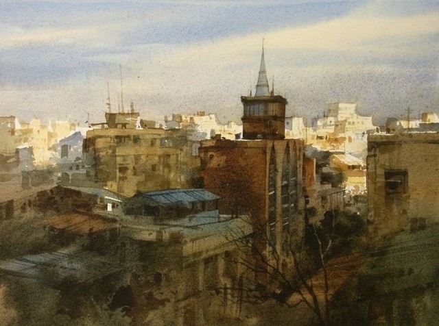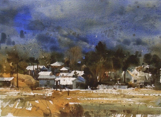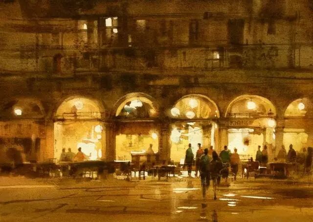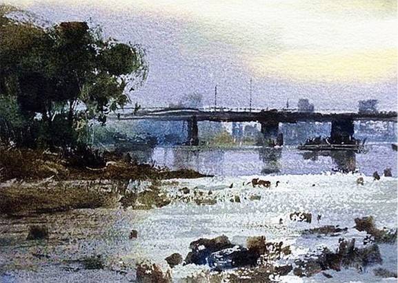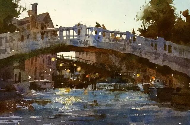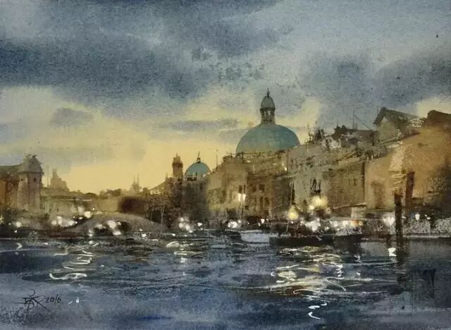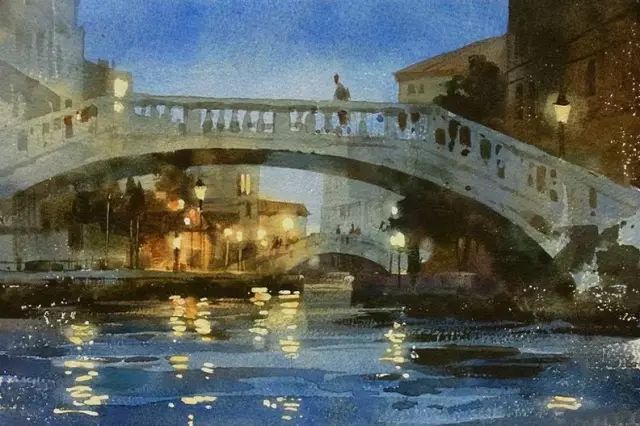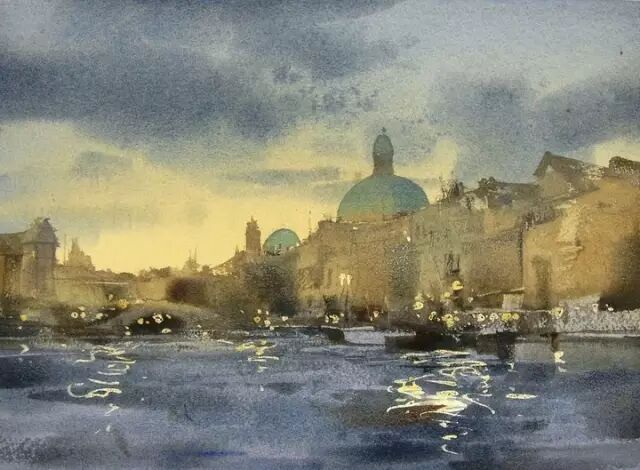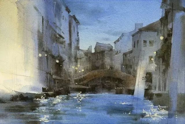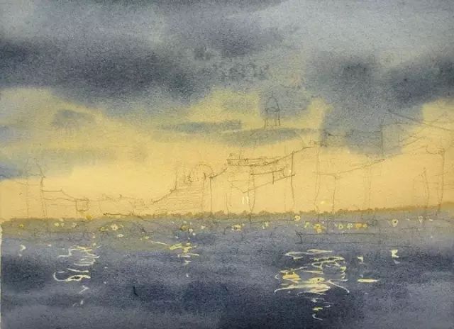 2.灯火夜景,是留白胶使用的好时机。把几盏路灯和水面反光遮盖起来之后,先打湿,再用钴蓝、群青、天蓝、Verditer,用排刷画天空和水面(画面的浅亮区)。逐渐提高浓度,画出乌云和水面几处波纹。当然,这两块可以个别画,一起画会慌了手脚,别给自己找麻烦。