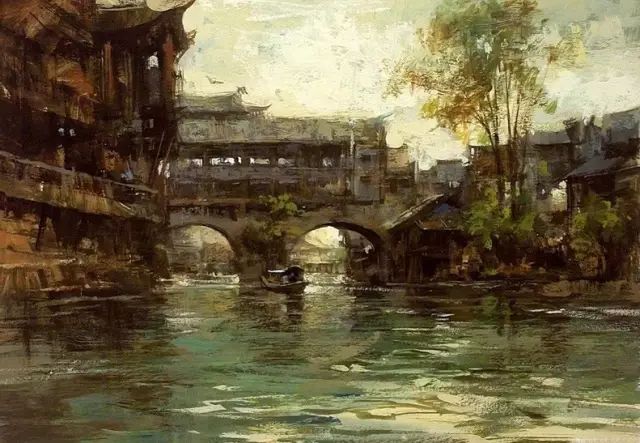 4 重点加工:喷水、刮擦、堆栈。去掉留白胶,将边缘柔洗成晕光,再补一些黄灯光色,水面波光可配合刮刀,搓、洗、刮出流畅的线条。