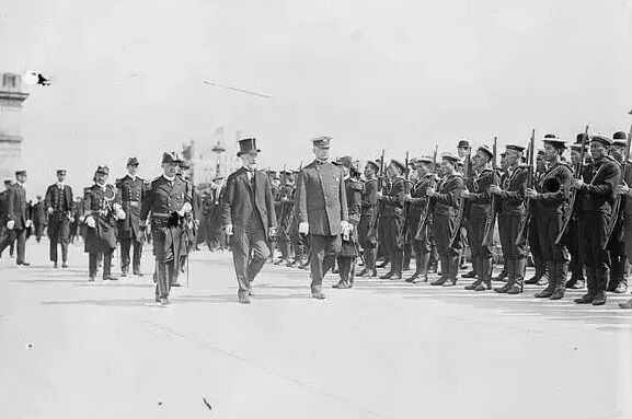 大清帝国巡洋舰队统领程璧光陪同纽约市市长检阅访问美国的清朝“海圻”号巡洋舰全体士兵: