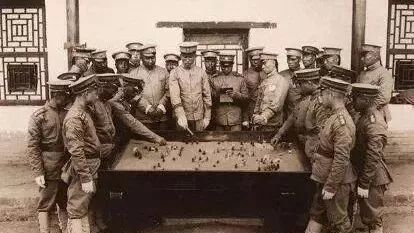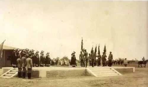 图为禁卫军阅兵式上,监国摄政王爱新觉罗·载沣向禁卫军长官授旗: