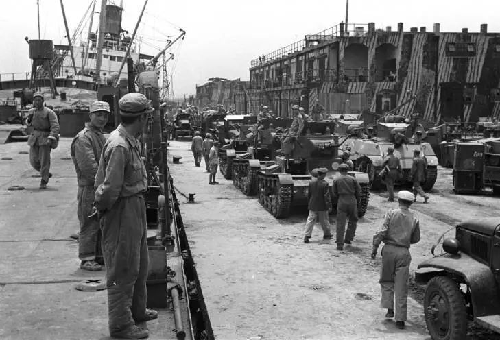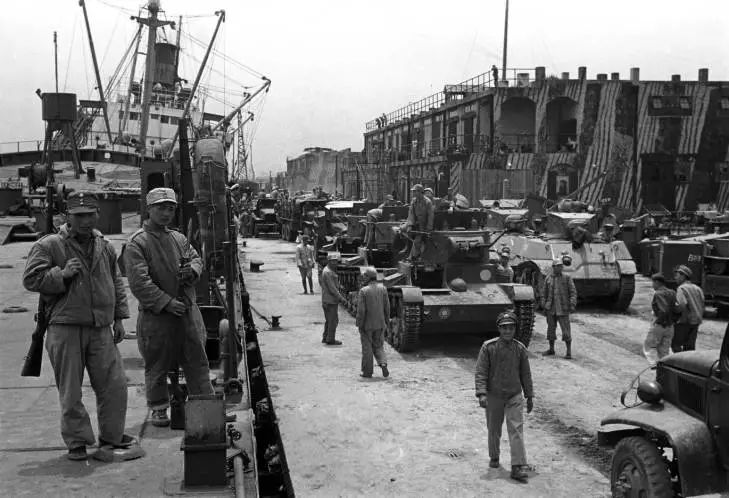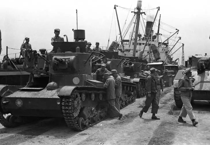 1949年,国民党军队在上海港口装运T-26坦克和美制M3A3坦克准备送往台湾。